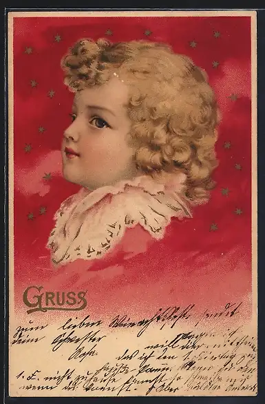 Lithographie Blonder Lockenschopf am Sternenhimmel