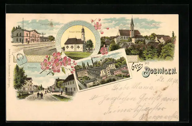 Lithographie Bobingen, Kunstmühle, Frauen-Kirche, Bahnhof