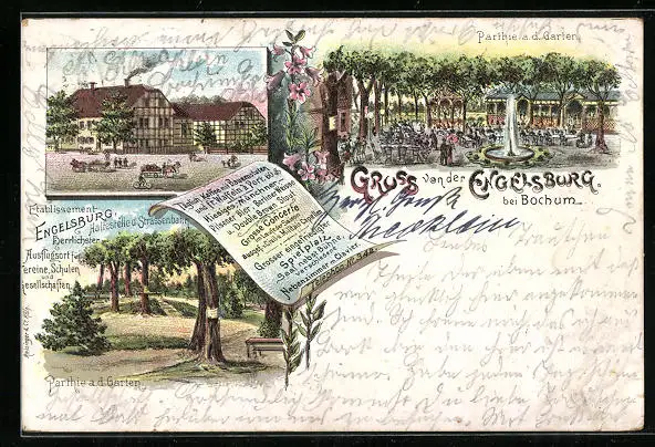 Lithographie Bochum, Gasthaus Engelsburg, Gartenpartien