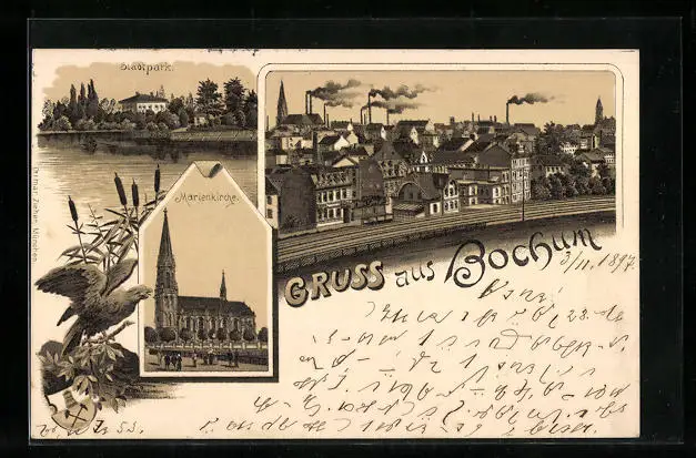 Lithographie Bochum, Marienkirche, Stadtpark, Totalansicht