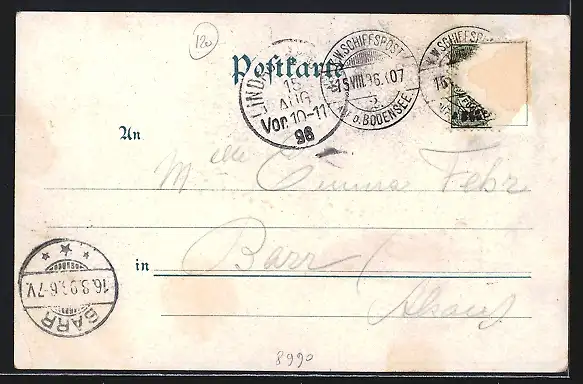 Personenbezogene Daten auf der Rückseite der Karte wurden durch blauen Textmarker unkenntlich gemacht. Die blauen Stellen sind auf die Vorderseite durchgeweicht und wirken sich negativ auf das Postkartenfoto aus