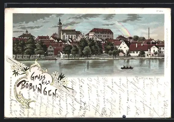 Lithographie Böblingen, Teilansicht mit Kirche vom Wasser aus