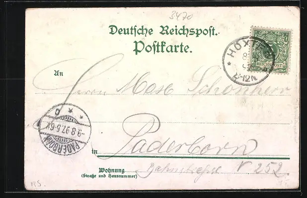 Personenbezogene Daten auf der Rückseite der Karte wurden durch blauen Textmarker unkenntlich gemacht. Die blauen Stellen sind auf die Vorderseite durchgeweicht und wirken sich negativ auf das Postkartenfoto aus