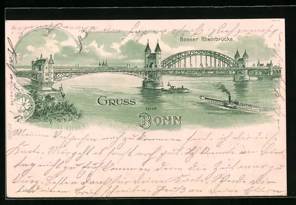 Lithographie Bonn, Bonner Rheinbrücke mit Dampfer
