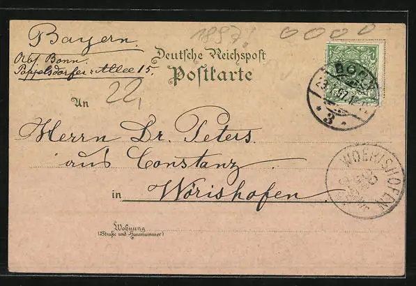 Personenbezogene Daten auf der Rückseite der Karte wurden durch blauen Textmarker unkenntlich gemacht. Die blauen Stellen sind auf die Vorderseite durchgeweicht und wirken sich negativ auf das Postkartenfoto aus