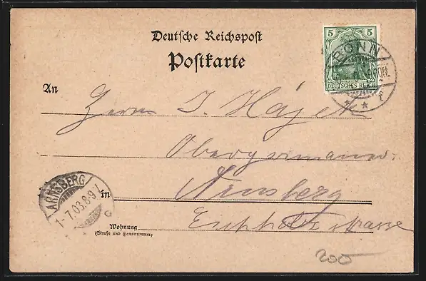 Personenbezogene Daten auf der Rückseite der Karte wurden durch blauen Textmarker unkenntlich gemacht. Die blauen Stellen sind auf die Vorderseite durchgeweicht und wirken sich negativ auf das Postkartenfoto aus