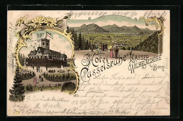 Lithographie Bonn, Hotel Casselsruhe, Aussicht von der Kaiser Wilhelmshöhe