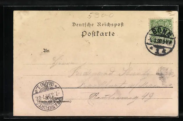Personenbezogene Daten auf der Rückseite der Karte wurden durch blauen Textmarker unkenntlich gemacht. Die blauen Stellen sind auf die Vorderseite durchgeweicht und wirken sich negativ auf das Postkartenfoto aus