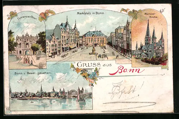 Lithographie Bonn, Marktplatz, Münsterkirche, Coblenzer Thor