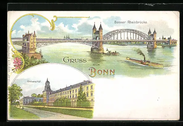 Lithographie Bonn, Marktplatz mit Denkmal, Rheinbrücke