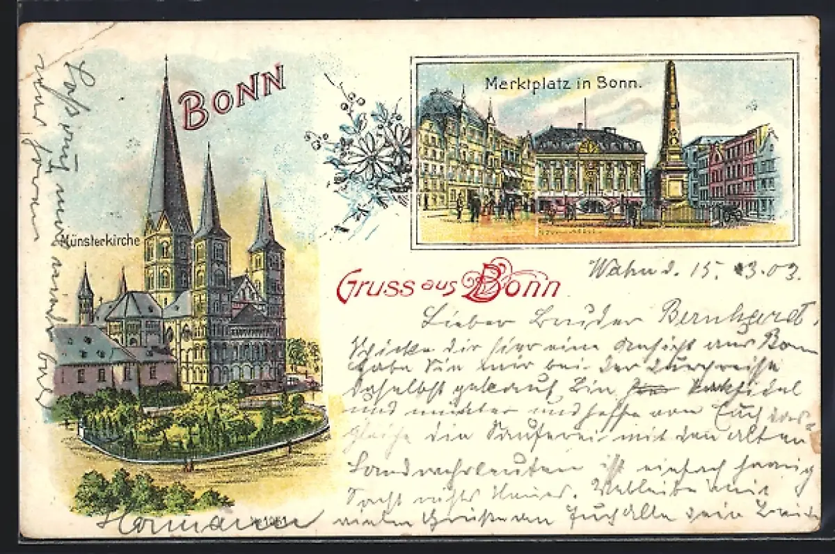 Lithographie Bonn, Münsterkirche, Marktplatz