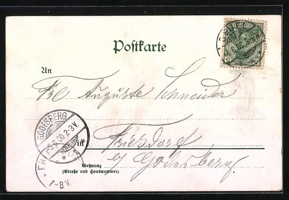 Personenbezogene Daten auf der Rückseite der Karte wurden durch blauen Textmarker unkenntlich gemacht. Die blauen Stellen sind auf die Vorderseite durchgeweicht und wirken sich negativ auf das Postkartenfoto aus