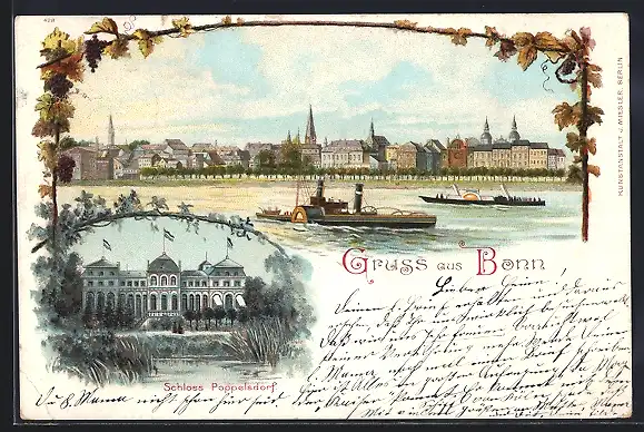 Lithographie Bonn, Rhein mit Dampfschiffen, Schloss Poppelsdorf
