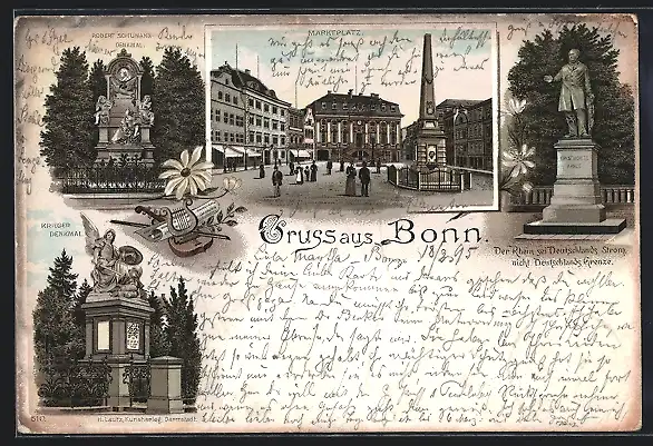 Lithographie Bonn, Robert Schumann-Denkmal, Marktplatz, Krieger-Denkmal