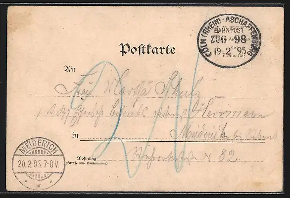 Personenbezogene Daten auf der Rückseite der Karte wurden durch blauen Textmarker unkenntlich gemacht. Die blauen Stellen sind auf die Vorderseite durchgeweicht und wirken sich negativ auf das Postkartenfoto aus