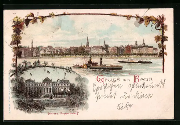 Lithographie Bonn, Schloss Poppelsdorf, Teilansicht mit Dampfern