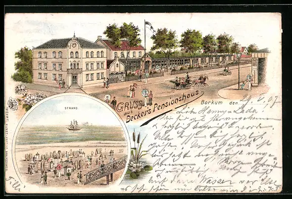 Lithographie Borkum, Becker`s Pensionshaus, Strand