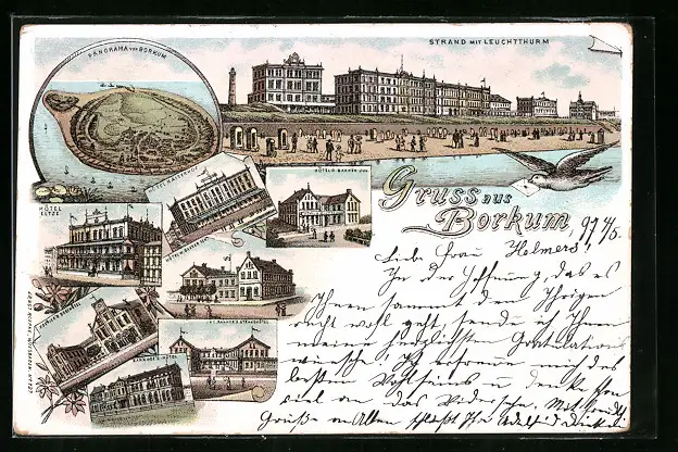 Lithographie Borkum, Strand mit Leuchtturm, Bahnhofs-Hotel