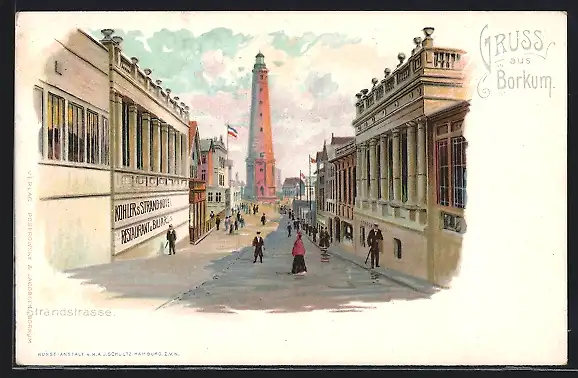 Lithographie Borkum, Strandstrasse mit Strandhotel