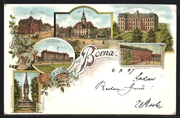 Lithographie Borna, Neue Kaserne, Königl Schullehrer Seminar, Post