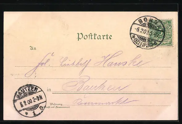 Personenbezogene Daten auf der Rückseite der Karte wurden durch blauen Textmarker unkenntlich gemacht. Die blauen Stellen sind auf die Vorderseite durchgeweicht und wirken sich negativ auf das Postkartenfoto aus