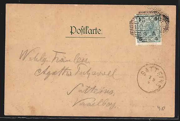 Personenbezogene Daten auf der Rückseite der Karte wurden durch blauen Textmarker unkenntlich gemacht. Die blauen Stellen sind auf die Vorderseite durchgeweicht und wirken sich negativ auf das Postkartenfoto aus