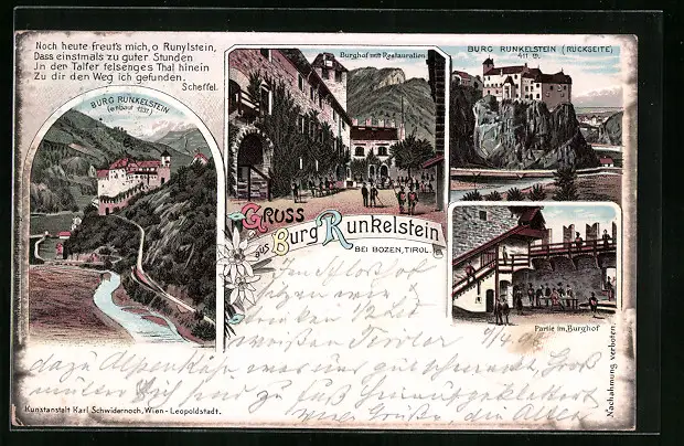 Lithographie Bozen, Burg Runkelstein, Burghof mit Restaurant