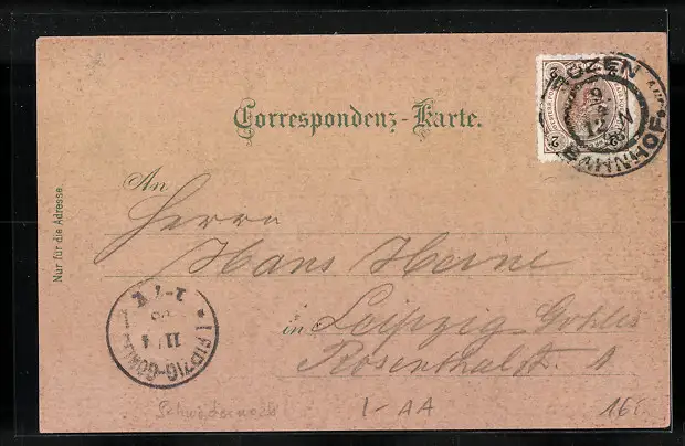 Personenbezogene Daten auf der Rückseite der Karte wurden durch blauen Textmarker unkenntlich gemacht. Die blauen Stellen sind auf die Vorderseite durchgeweicht und wirken sich negativ auf das Postkartenfoto aus