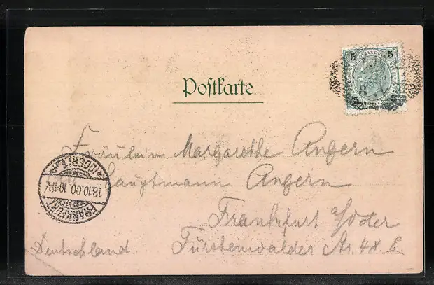 Personenbezogene Daten auf der Rückseite der Karte wurden durch blauen Textmarker unkenntlich gemacht. Die blauen Stellen sind auf die Vorderseite durchgeweicht und wirken sich negativ auf das Postkartenfoto aus