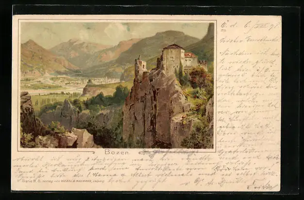 Lithographie Bozen, Ortsansicht aus der Vogelschau