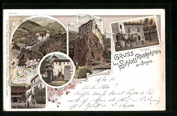 Lithographie Bozen, Schloss Runkelstein, Zugbrücke, Burghof