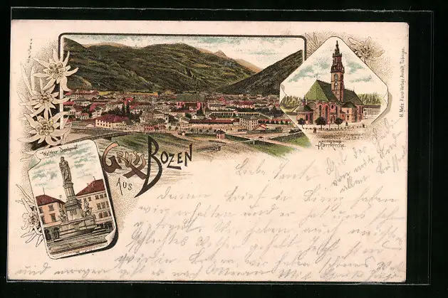Lithographie Bozen, Walther Denkmal, Pfarrkirche, Panorama