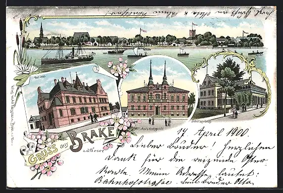 Lithographie Brake / Weser, Schützenhaus, Post-Amt, Flusspartie