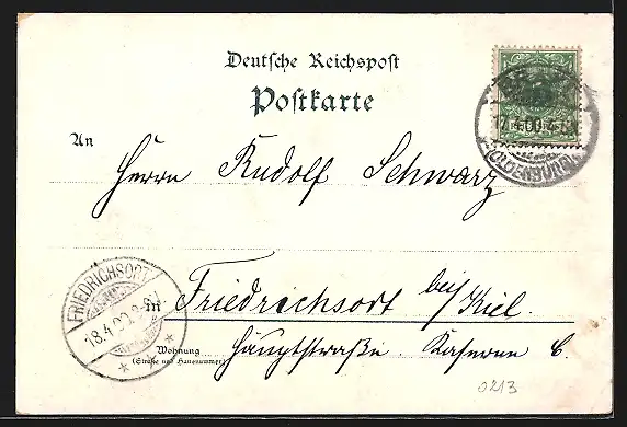 Personenbezogene Daten auf der Rückseite der Karte wurden durch blauen Textmarker unkenntlich gemacht. Die blauen Stellen sind auf die Vorderseite durchgeweicht und wirken sich negativ auf das Postkartenfoto aus