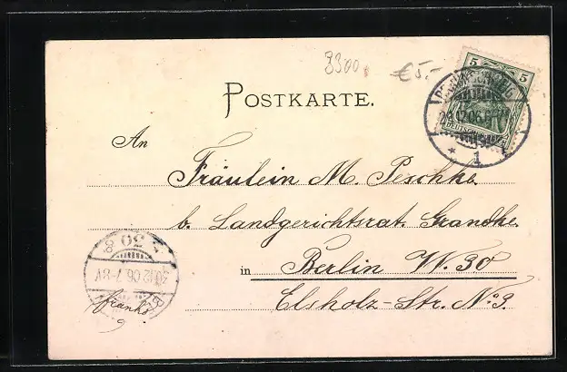Personenbezogene Daten auf der Rückseite der Karte wurden durch blauen Textmarker unkenntlich gemacht. Die blauen Stellen sind auf die Vorderseite durchgeweicht und wirken sich negativ auf das Postkartenfoto aus