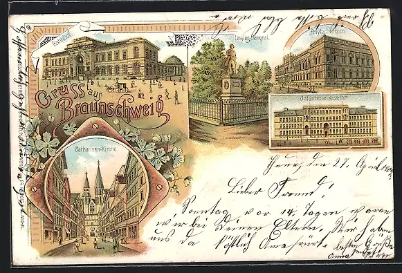 Lithographie Braunschweig, Bahnhof, Lessing-Denkmal, Catharinenkirche, Polytechnikum, Infanterie-Kaserne