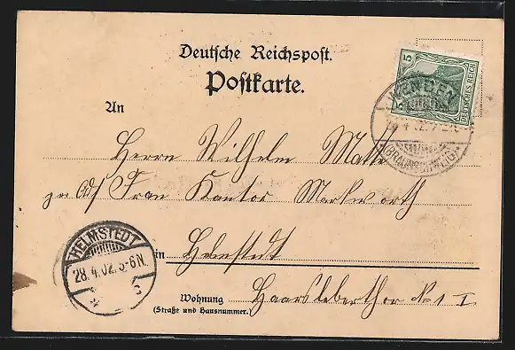 Personenbezogene Daten auf der Rückseite der Karte wurden durch blauen Textmarker unkenntlich gemacht. Die blauen Stellen sind auf die Vorderseite durchgeweicht und wirken sich negativ auf das Postkartenfoto aus
