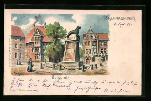 Lithographie Braunschweig, Burgplatz mit Denkmal