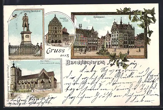 Lithographie Braunschweig, Der Dom, Lessingdenkmal, Gewandhaus, Kohlmarkt