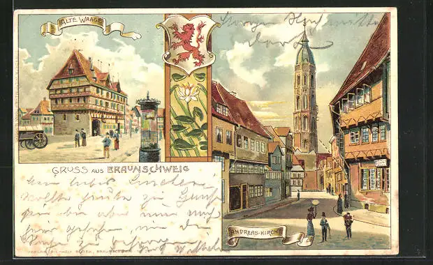 Lithographie Braunschweig, Gasthaus Alte Waage mit Litfasssäule, Andreas-Kirche