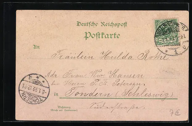 Personenbezogene Daten auf der Rückseite der Karte wurden durch blauen Textmarker unkenntlich gemacht. Die blauen Stellen sind auf die Vorderseite durchgeweicht und wirken sich negativ auf das Postkartenfoto aus