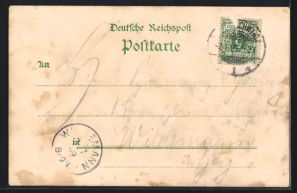 Personenbezogene Daten auf der Rückseite der Karte wurden durch blauen Textmarker unkenntlich gemacht. Die blauen Stellen sind auf die Vorderseite durchgeweicht und wirken sich negativ auf das Postkartenfoto aus