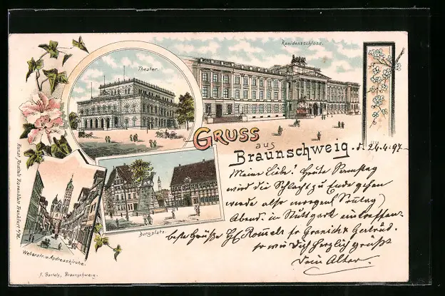Lithographie Braunschweig, Residenzschloss, Theater, Burgplatz