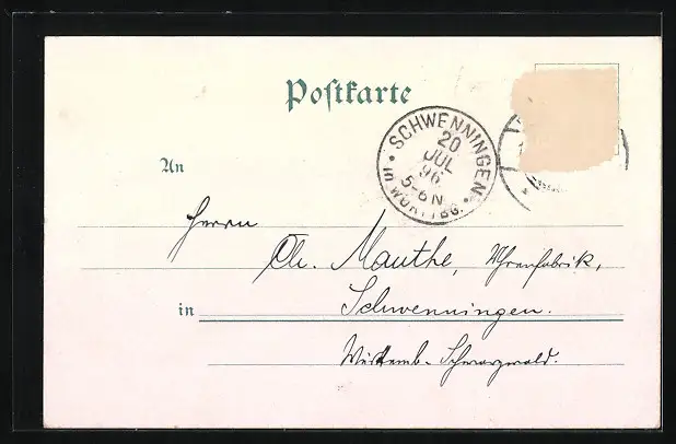 Personenbezogene Daten auf der Rückseite der Karte wurden durch blauen Textmarker unkenntlich gemacht. Die blauen Stellen sind auf die Vorderseite durchgeweicht und wirken sich negativ auf das Postkartenfoto aus
