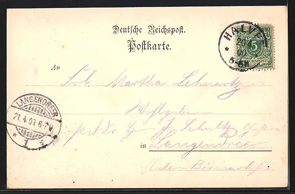 Personenbezogene Daten auf der Rückseite der Karte wurden durch blauen Textmarker unkenntlich gemacht. Die blauen Stellen sind auf die Vorderseite durchgeweicht und wirken sich negativ auf das Postkartenfoto aus