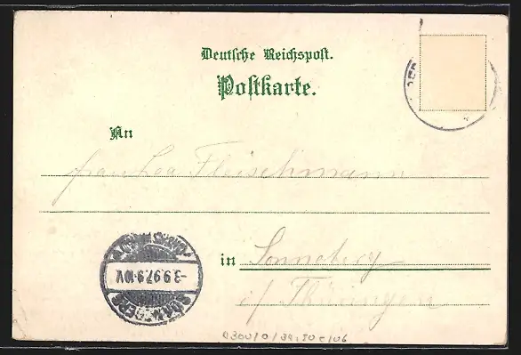 Personenbezogene Daten auf der Rückseite der Karte wurden durch blauen Textmarker unkenntlich gemacht. Die blauen Stellen sind auf die Vorderseite durchgeweicht und wirken sich negativ auf das Postkartenfoto aus