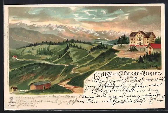 Lithographie Bregenz, Gruss vom Pfänder in der Dämmerung