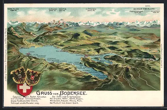 Lithographie Bregenz, Landkarte mit Bodensee, Wappen