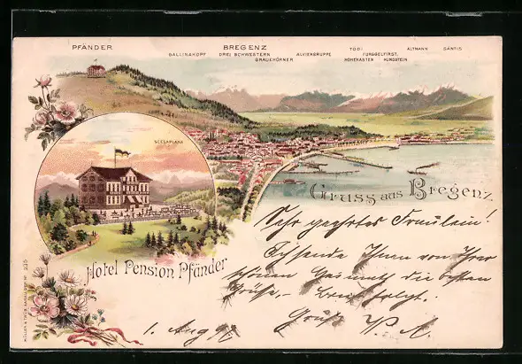 Lithographie Bregenz, Ortsansicht mit Hotel Pension Pfänder