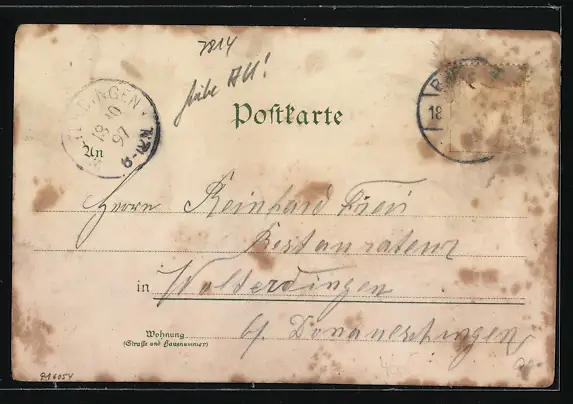 gelaufen 1897, Briefmarke entfernt, Ecken bestoßen, Bugspur u. Einriss oben li., guter Zustand